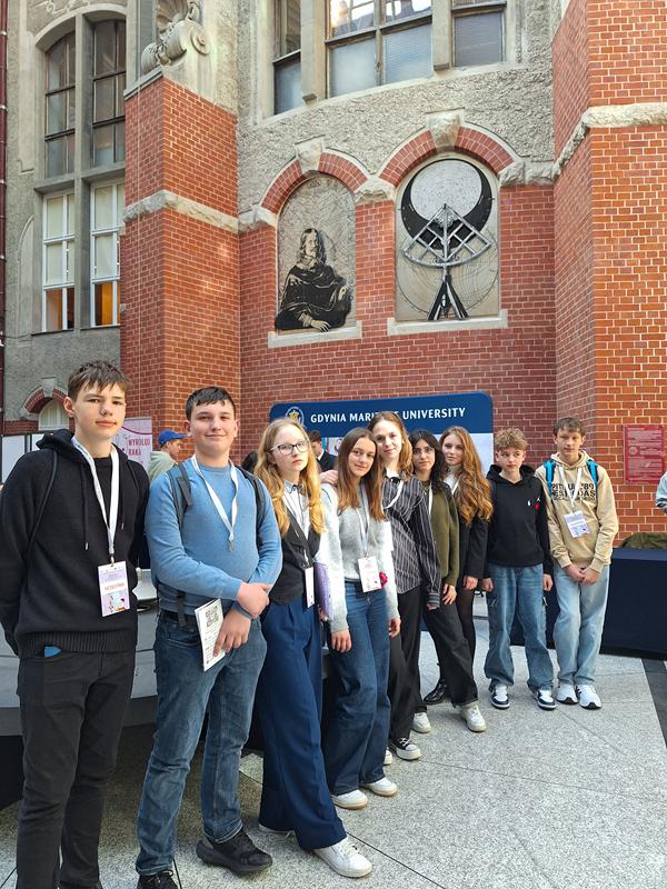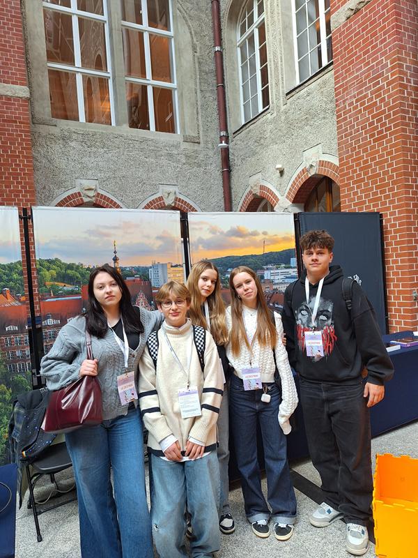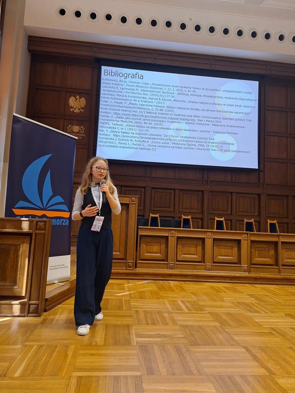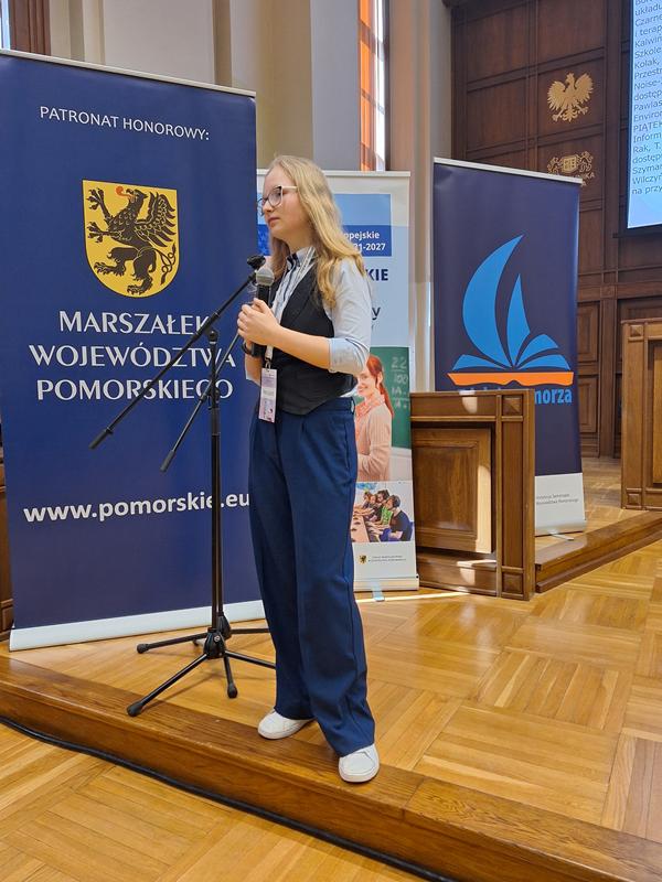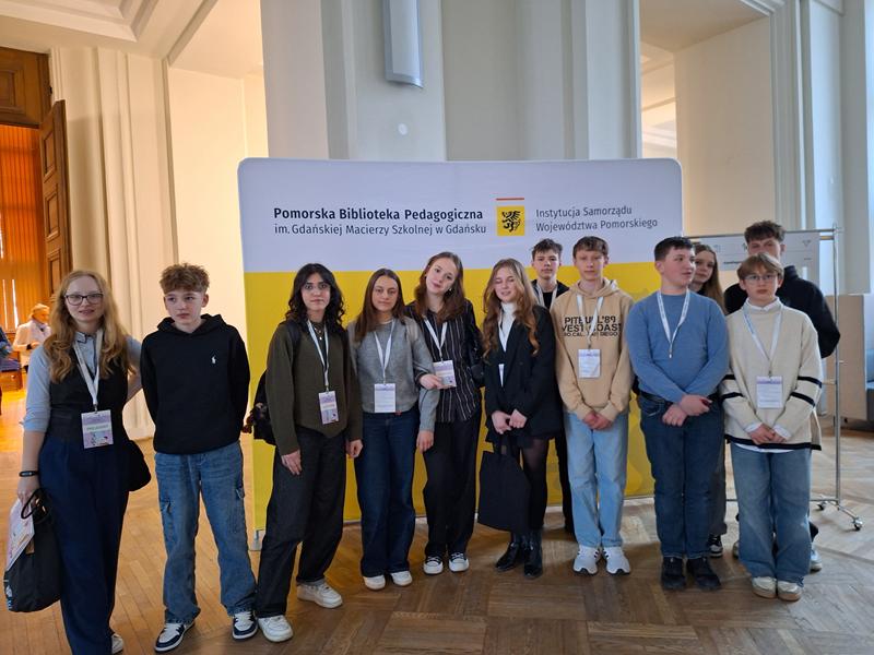 Dnia 5 kwietnia 2025r. uczniowie z koła młodego chemika wraz z nauczycielem Aleksandrą Janowitz-Chećko uczestniczyli po raz drugi w Uczniowskiej Konferencji Naukowej " Zmysły-jak postrzegamy świat i siebie?" Spotkanie zaczęło się od wykładu prof.  PG " Jak mózg buduje obraz świata". Następnie uczniowie przedstawiali swoje prezentacje na wybrany temat, w tym nasza uczennica klasy 8a Beata Dibowska, która wybrała temat "Wpływ hałasu na ludzki organizm" . Wystąpienie Beaty bardzo się podobało zarówno naszej grupie, jak i pozostałym uczestnikom. Beata zebrała sporo gratulacji i słów uznania. Przygotowała się bardzo profesjonalnie i zaciekawiła wszystkich swoim wystąpieniem. Uczniowie wraz z nauczycielem wrócili bardzo zadowoleni i dumni z koleżanki, która zaprezentowała się bardzo pozytywnie. Konferencja realizowana jest w ramach unijnego projektu "Zdolni z Pomorza".
