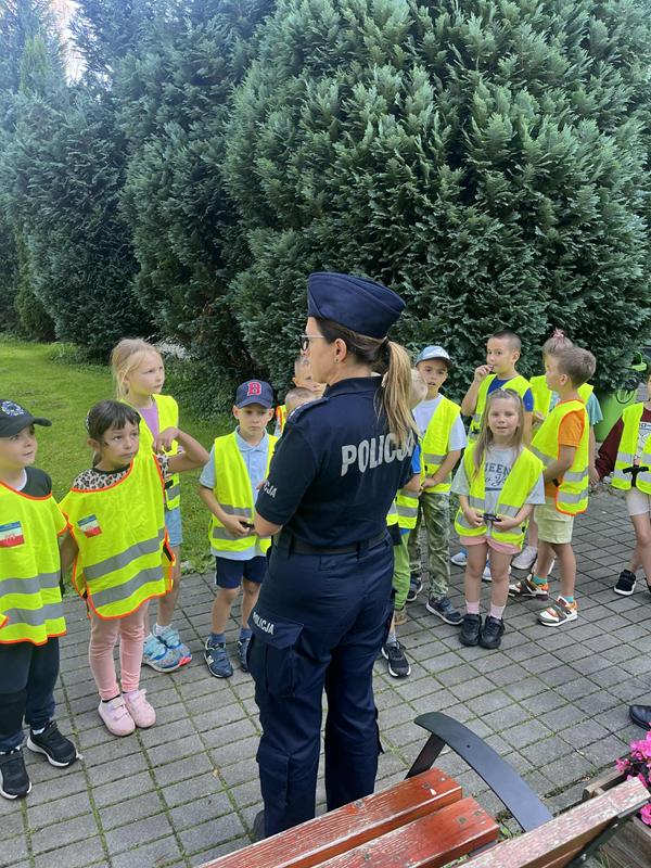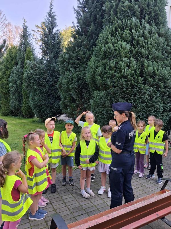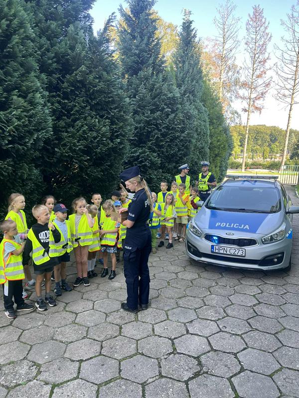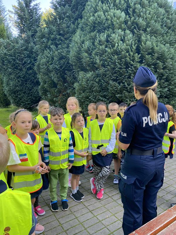 Dzieci otrzymały od Policjantów miłe upominki -  zawieszki odblaskowe do umocowania na plecakach.