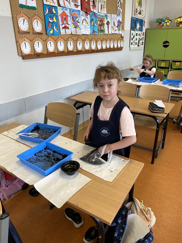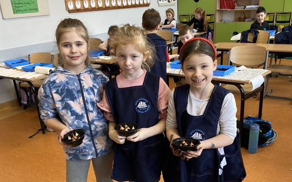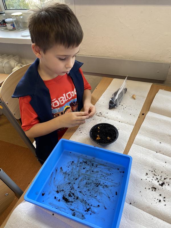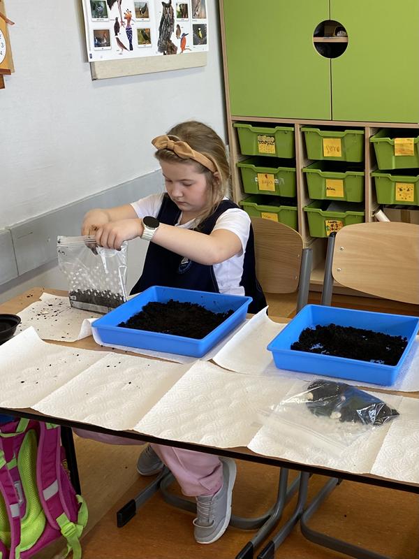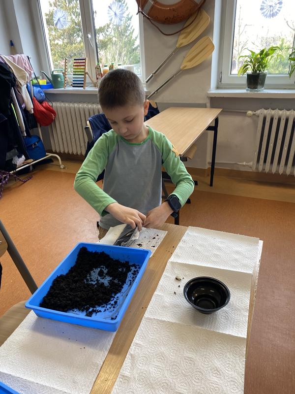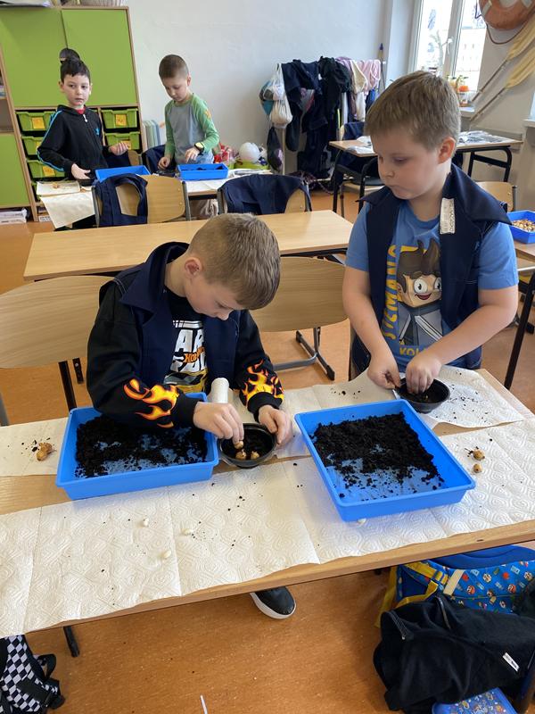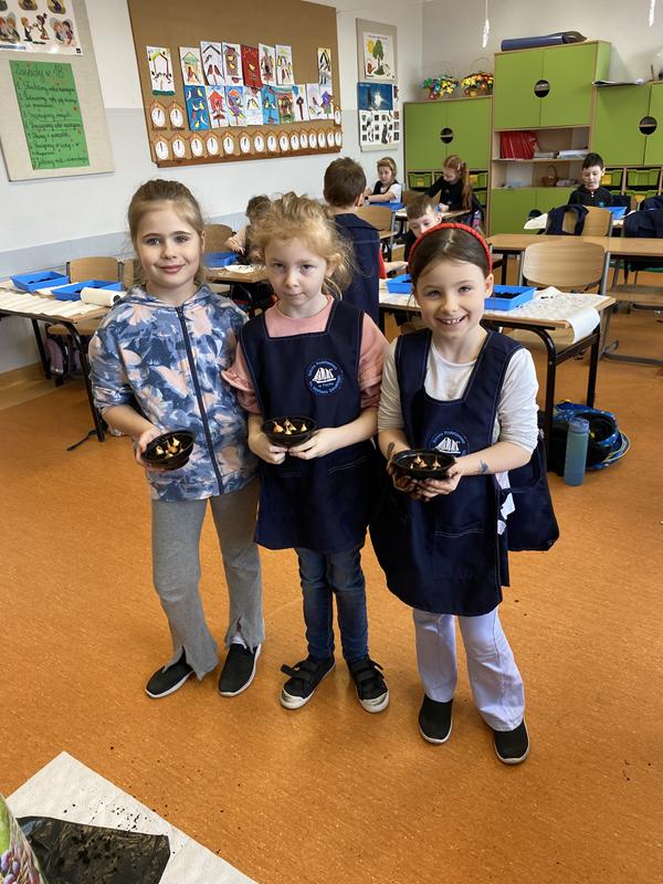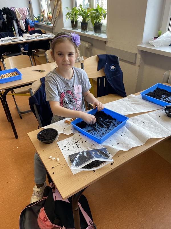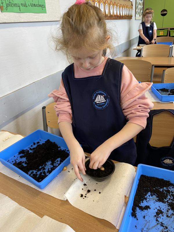 W ostatnich dniach w klasie 1b trwały przygotowania do nadejścia wiosny. Dzieci z zaangażowaniem uczestniczyły w zajęciach przyrodniczych, podczas których sadziły cebulkę dymkę oraz fasolę.